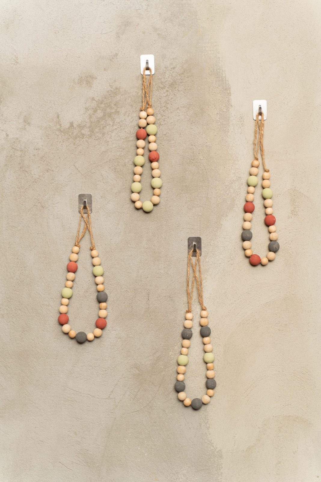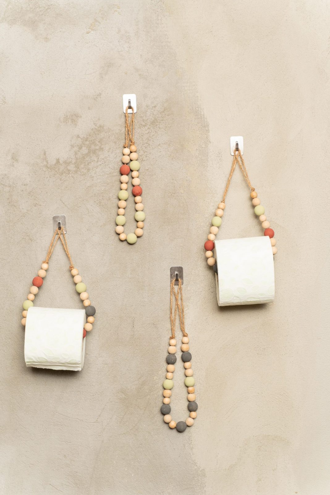 Suport de hartie igienica cu bile de lemn colorate.